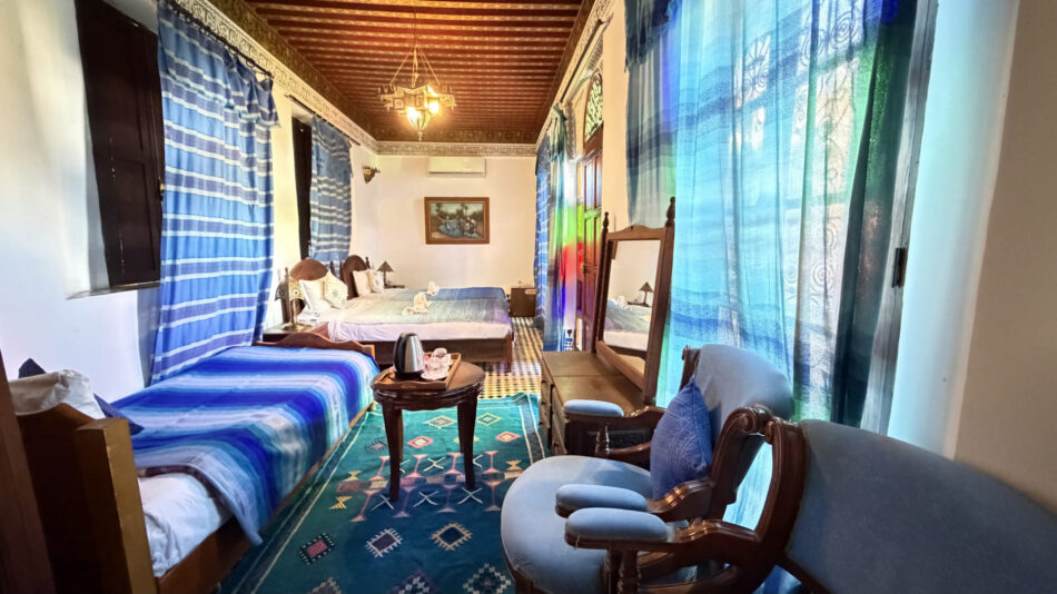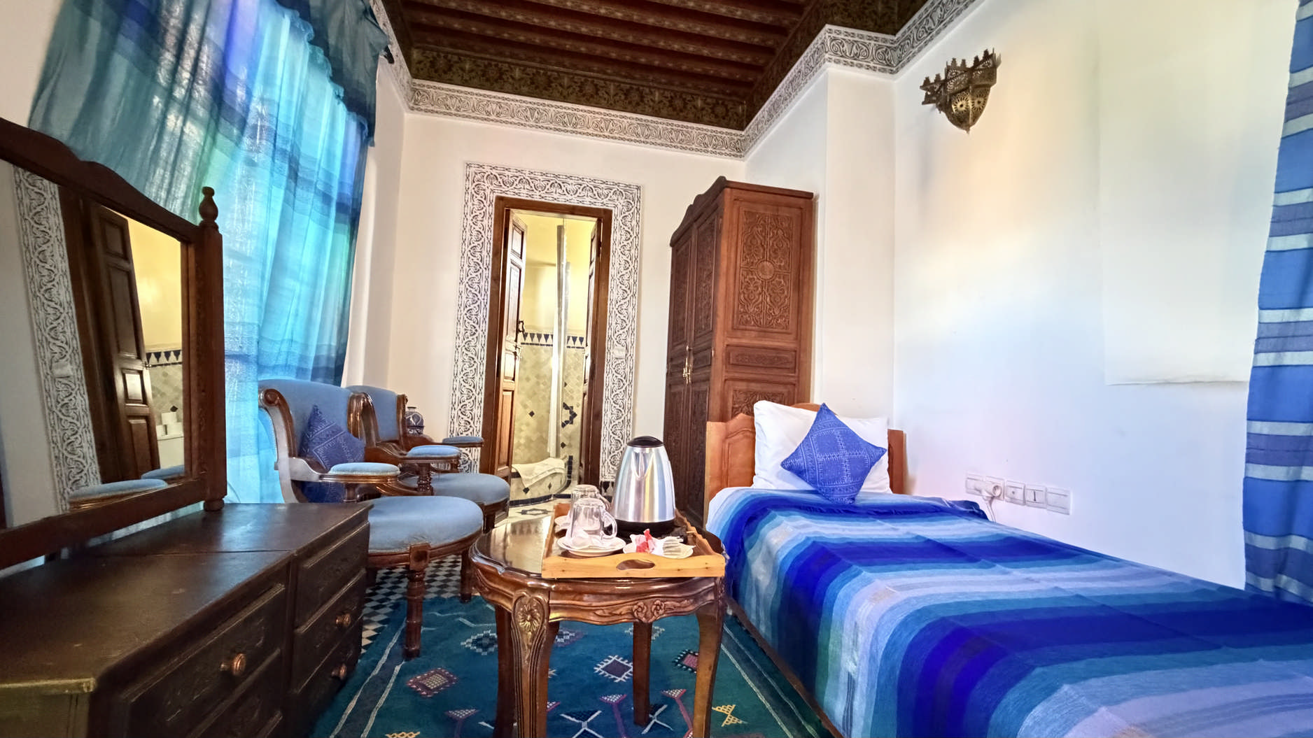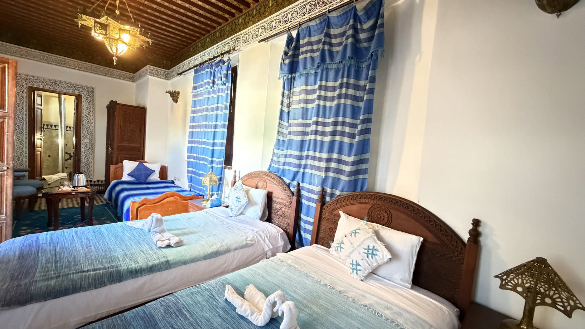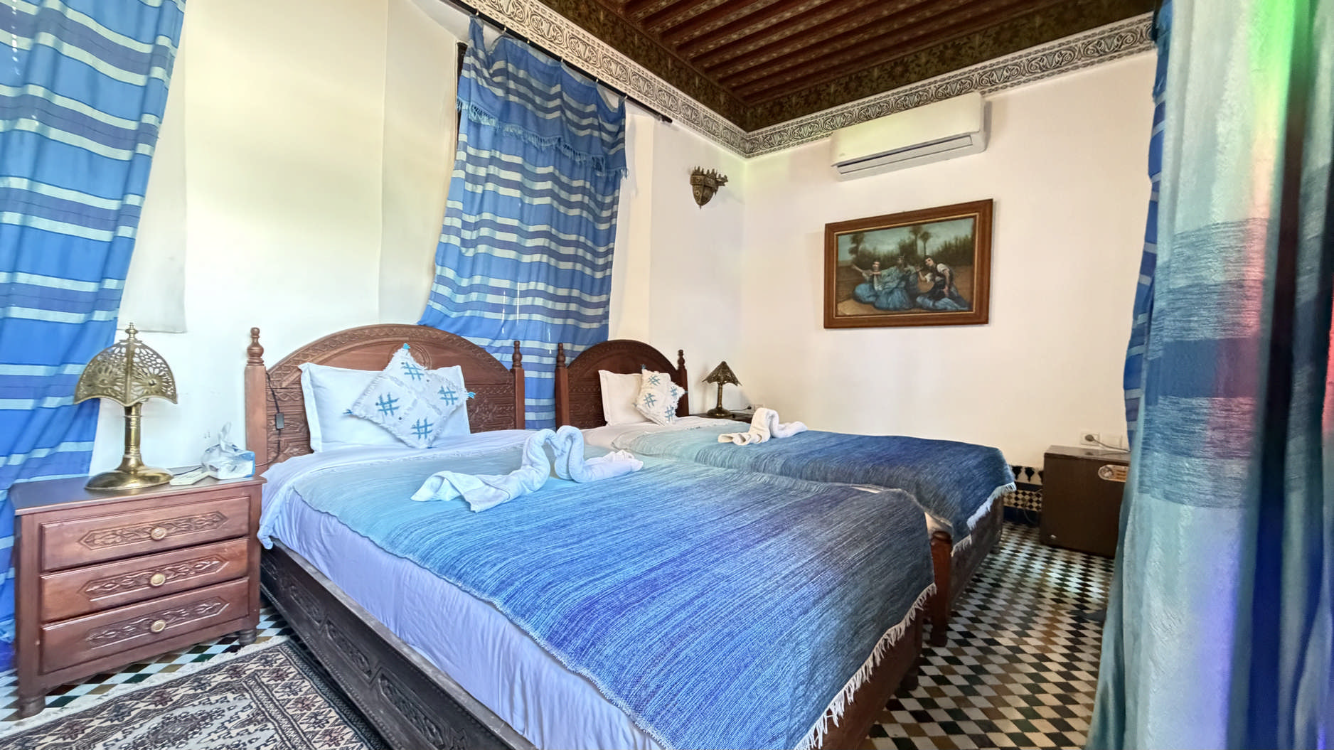 Spacieuse et lumineuse, elle dispose d’un grand lit double, d’un coin salon traditionnel et d’une salle de bain luxueuse ornée de zelliges faits à la main.