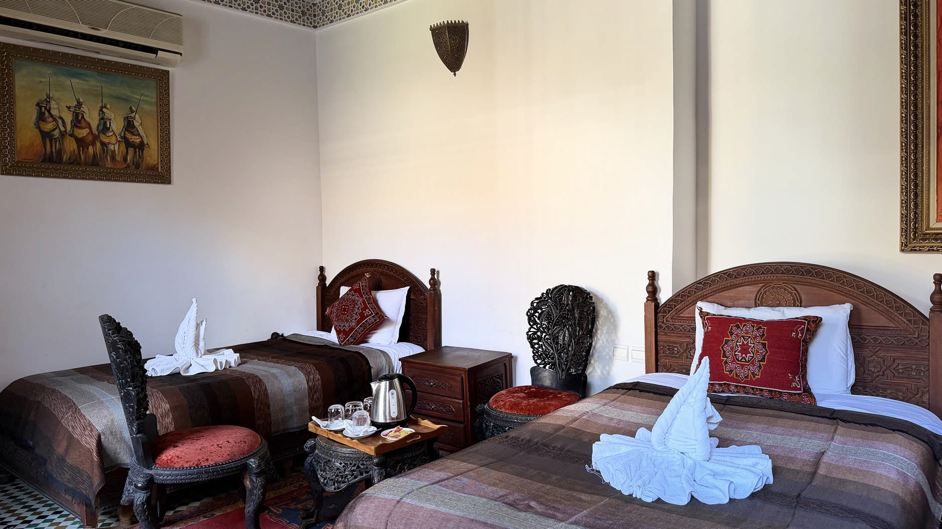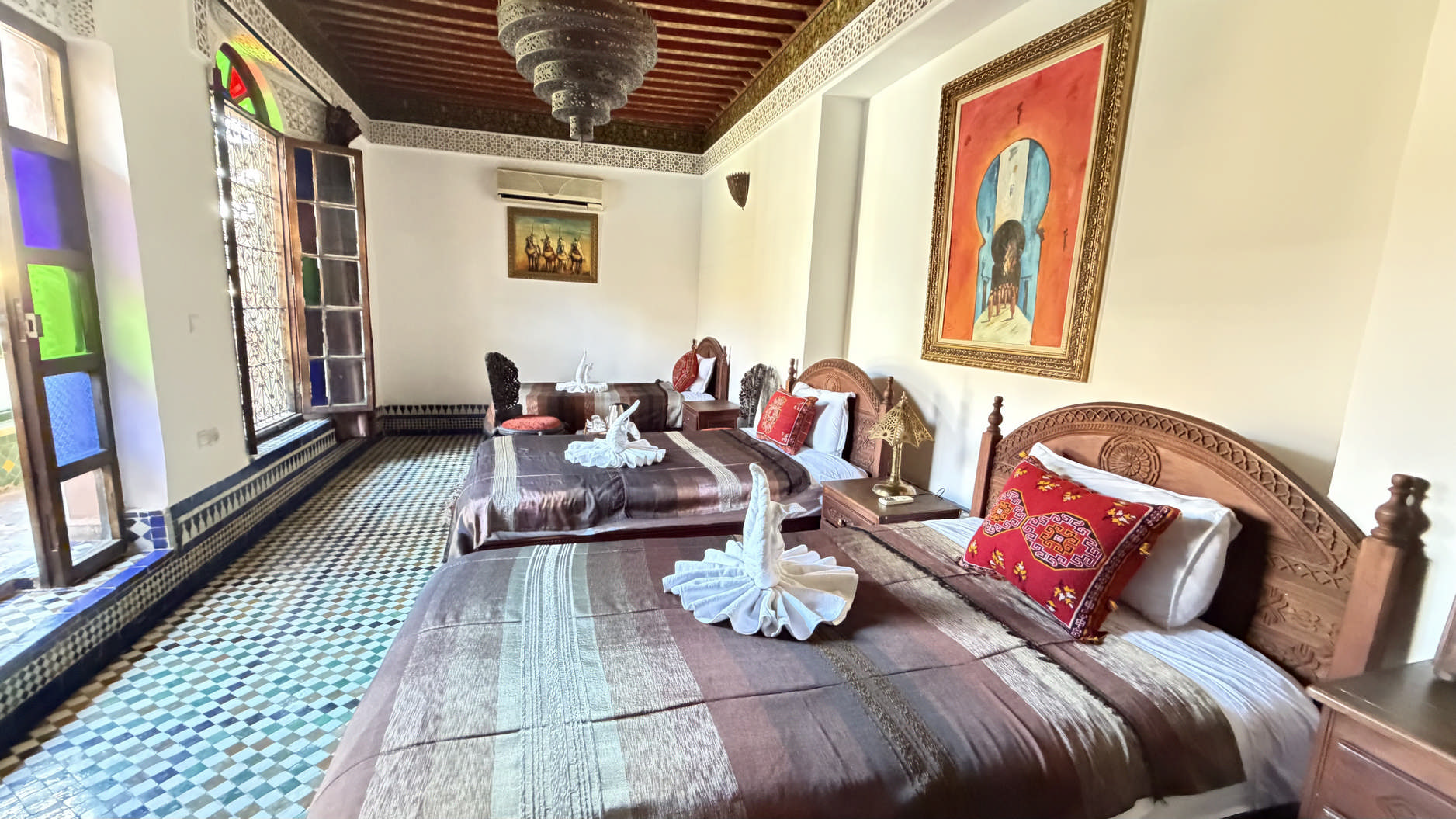 Son décor riche en textures – bois sculpté, tissus brodés, mosaïques artisanales – plonge ses hôtes dans une ambiance digne des palais d’antan.